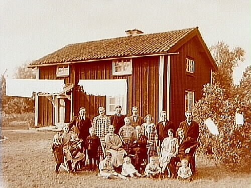 Tvåvånings bostadshus med skärmtak över ingången, 19 personer framför huset.