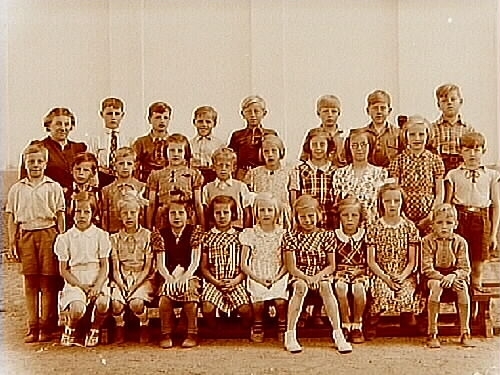 Marsfältets skola, 26 skolbarn med lärarinna fru K. Jansson, på skolgården.