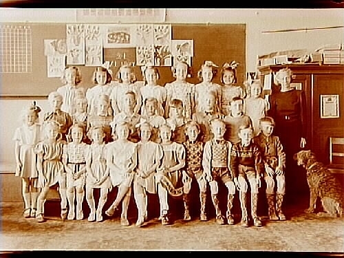 Vasaskolan, klassrumsinteriör, 27 skolbarn med lärarinna fru Jansson-Lindqvist, klass 2L, sal 3.