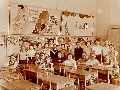 Rynningeskolan, klassrumsinteriör, 21 skolbarn med lärarinna fru Maj Restadh, klass 4Cc, sal 2.