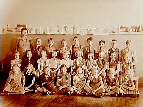 Olaus Petriskolan, klassrumsinteriör, 26 skolbarn med lärarinna fru Adina Myhrberg, klass 2a, sal 7.