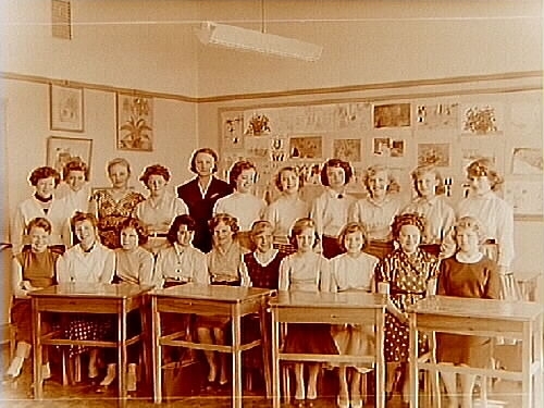 Engelbrektsskolan, klassrumsinteriör, 20 flickor med lärarinna fröken Dagny Borstedt, klass 8f, sal 21.