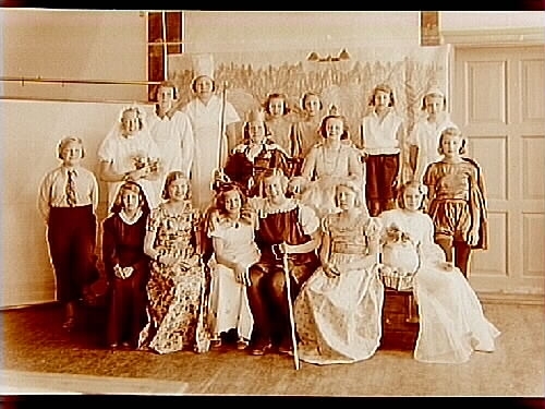 Vasaskolan, skolteater, 17 utklädda flickor.