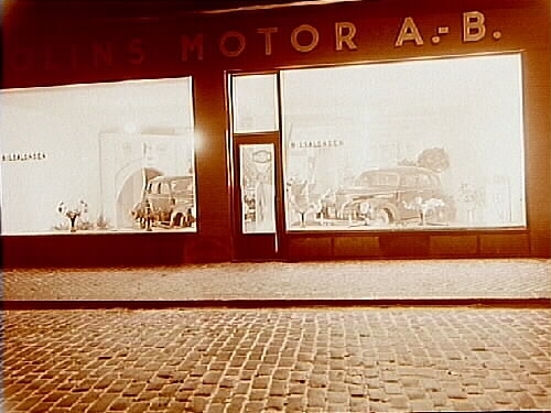 Skyltfönster med amerikanska bilar av märket De Soto.
