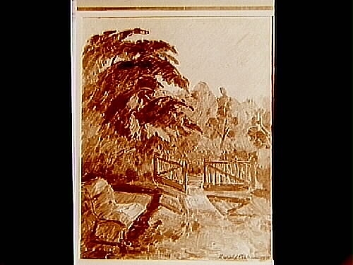 Oljemålning. Motiv: Parksoffa och grind, av konstnären Harald Eriksson, 1939.