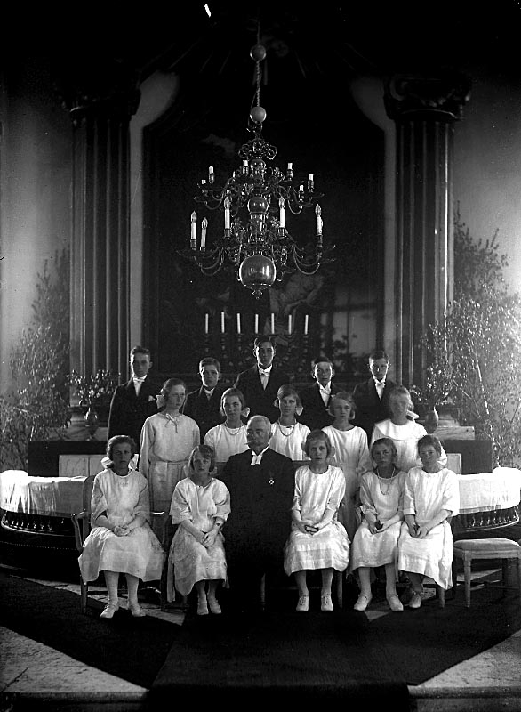 Titel: Kyrkointeriör, konfirmation, konfirmander och en präst.