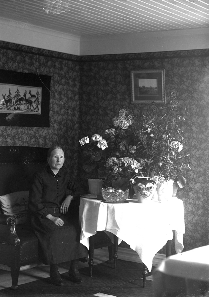 Rumsinteriör, en kvinna vid bordet. Högtid.