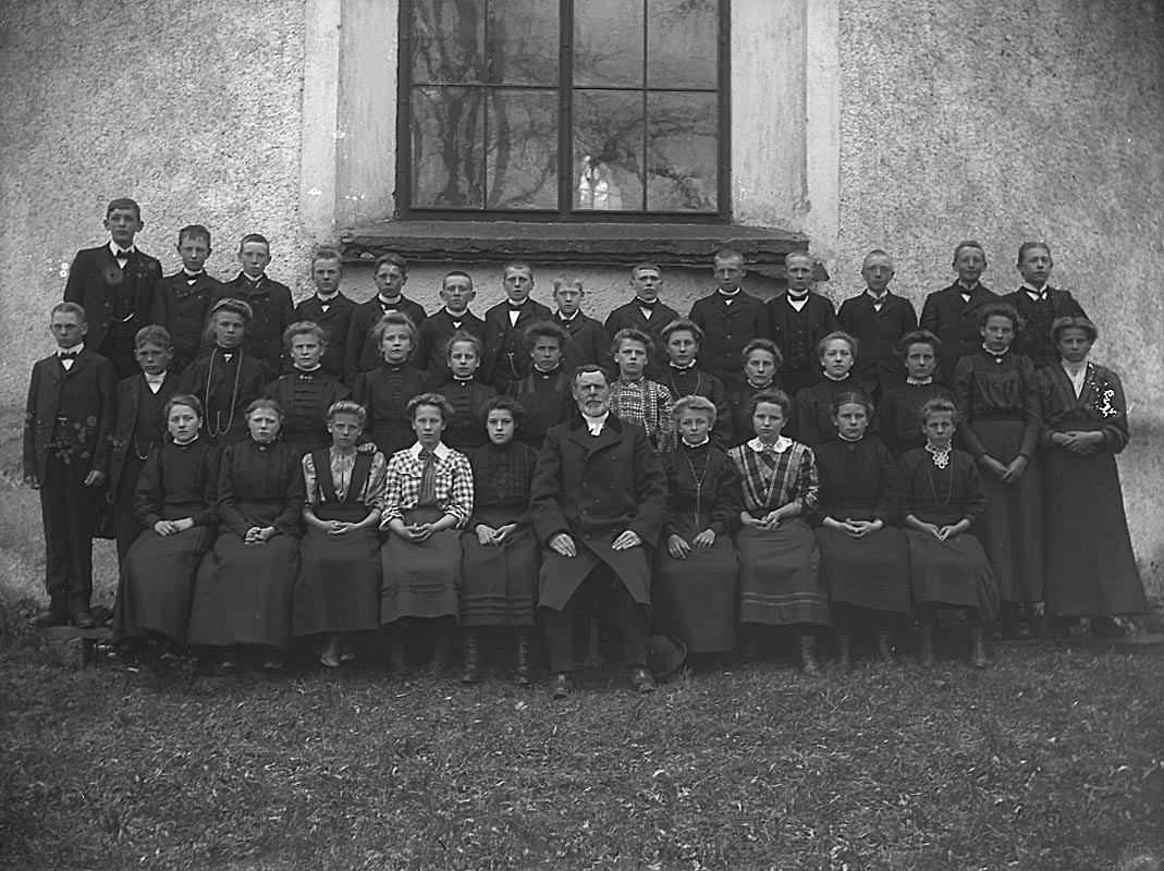 Titel: Konfirmation, konfirmander och en präst. Kyrkobyggnad.
