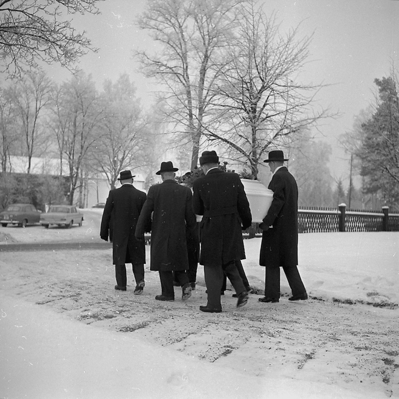 Begravning i Ljusnarsbergs kyrka, män som bär likkistan ut från kyrkan.
