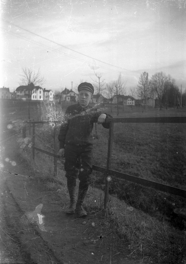 En pojke. Bostadshus i bakgrunden.