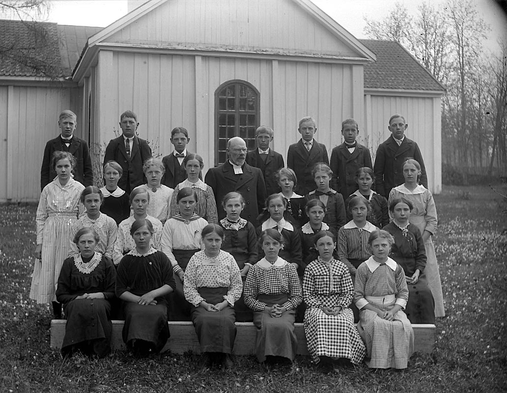 Konfirmation (?), barn och en präst. Kyrkobyggnad i bakgrunden.