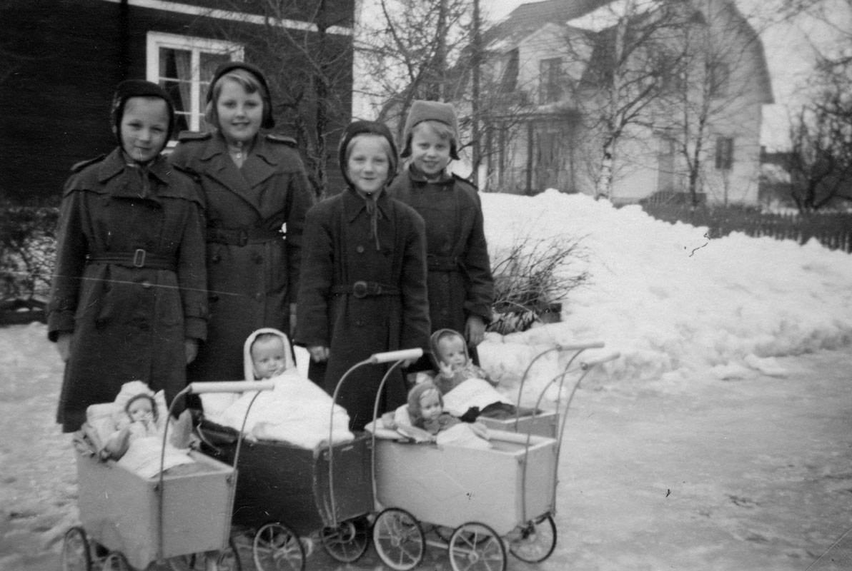 Fyra flickor med dockor och dockvagnar. "Nu är det mars 1950, men ungarna har inte växt något. Vitaminbrist ?"