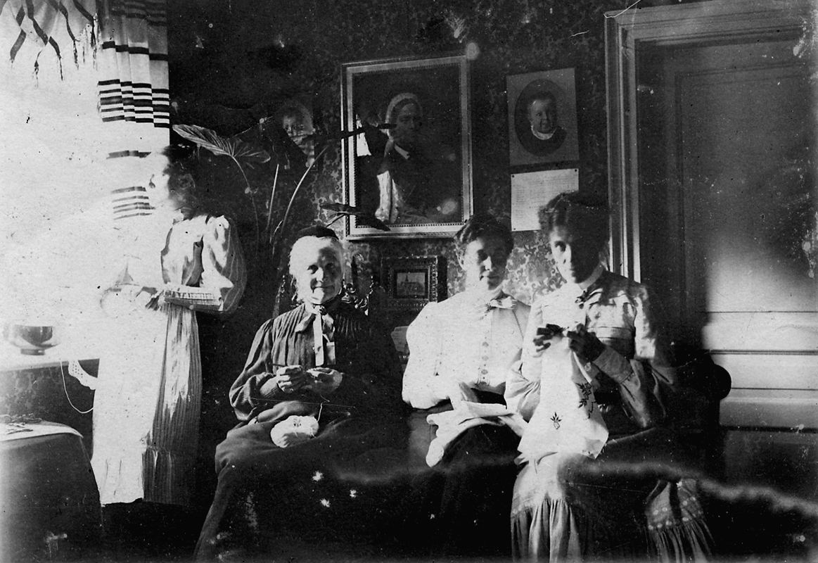 Rumsinteriör, fyra kvinnor. Broderi, virkning, m.m.