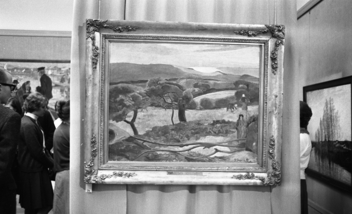 Tavla med landskapsmotiv hänger på fristående vägg i större utställningslokal där människor minglar