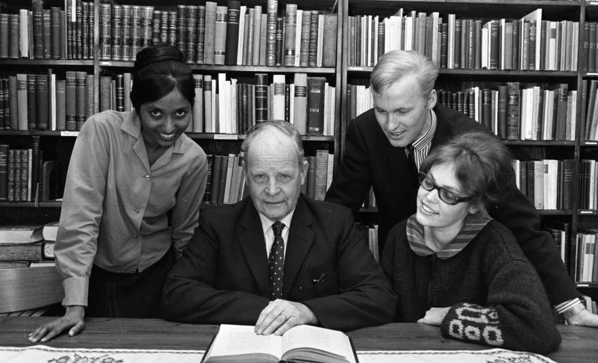 Fyra personer vid ett bord. Längst till vänster står en ung indisk kvinna. Bredvid henne till höger sitter en äldre herre i kavaj, skjorta och slips. Till höger om honom sitter en ung kvinna med glasögon och mellan henne och den äldre mannen står en ung man i kavaj, skjorta och slips. Den äldre mannen har lagt sin vänstra hand på en uppslagen bok på bordet. I bakgrunden står massor med bokhyllor med böcker i.