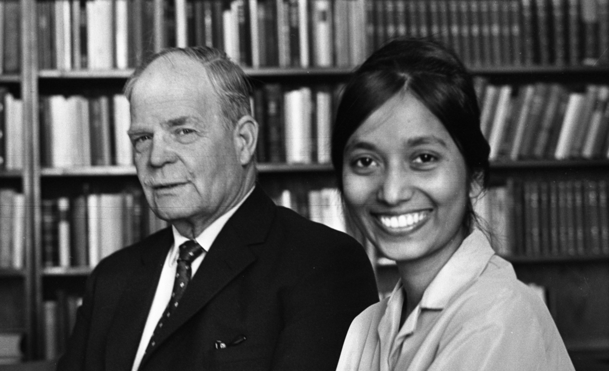 En äldre man i kostym, skjorta och slips och en ung indisk kvinna i blus sitter i ett rum fyllt med böcker i bokhyllor.