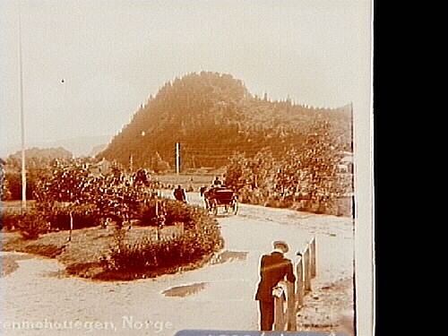 Landsväg med en hästskjuts, två personer på vägen . Ett berg i bakgrunden.