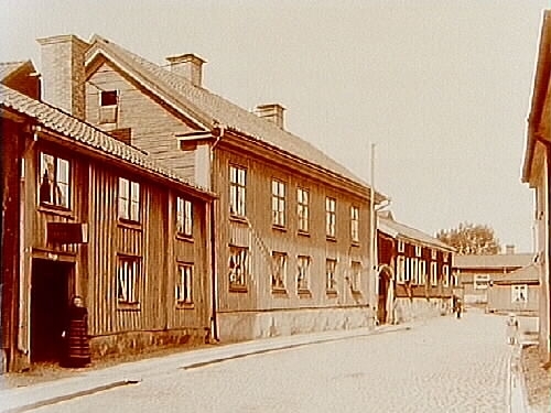 Tvåvånings trähus, det första till vänster den s.k. Schantzska gården. En och en halvvånings trähus med hög stenfot.