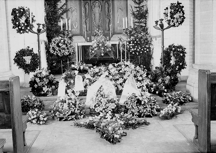 Kyrkointeriör, begravning, likkista och begravningskransar.