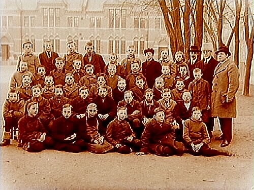 Trädgårdsskolan, skolslöjden, 42 skolpojkar med lärare. Skolbyggnad i bakgrunden.