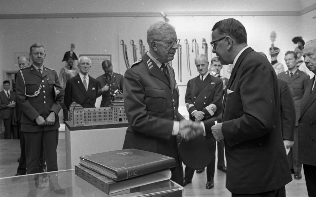 Kung Gustav VI Adolf besöker Örebro läns museum tillsammans med militärer. Kungen är liksom de andra männen klädd i militäruniform. I mitten av lokalen finns en stor miniatyrmodell av Örebro slott. Glasmontrar står i lokalen och sablar samt tavlor hänger på väggen. Kungen skakar hand med en kostymklädd man.