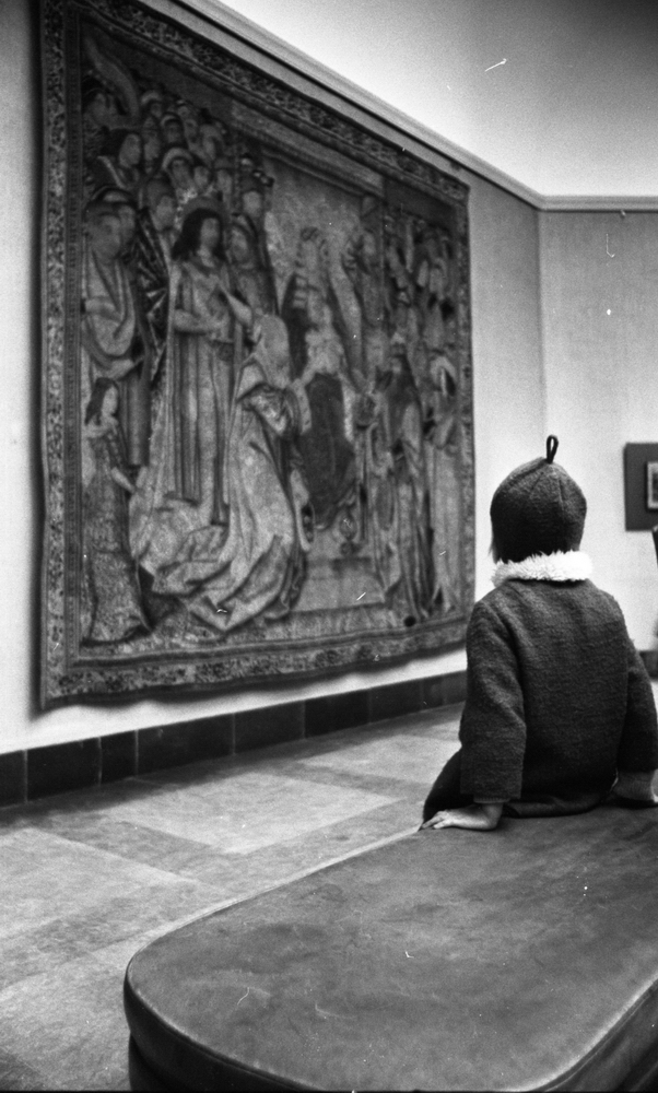 En liten flicka klädd i mörk kappa med vit krage samt mörk mössa sitter på en bänk och tittar på en väggbonad på en konstutställning.