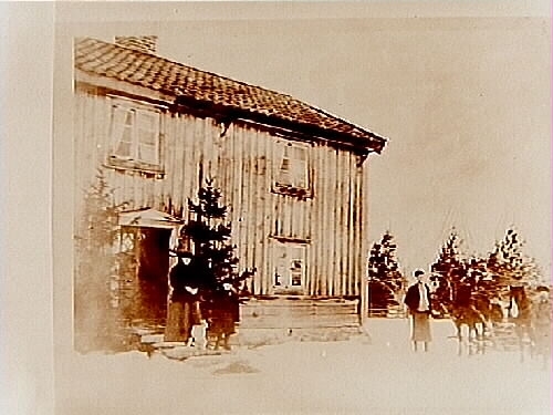 Förminskad motiv för tennfat, tvåvånings ålderdomligt bostadshus med två personer på trappan, en släde med två hästar, två män.