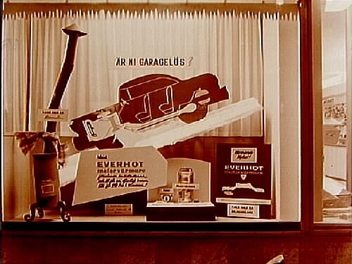 Svenska skiffer AB:s skyltfönster med varmvattenberedare och motorvärmare.