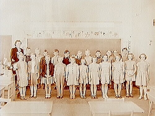 Rostaskolan, klassrumsinteriör, skolklass med fröken.
