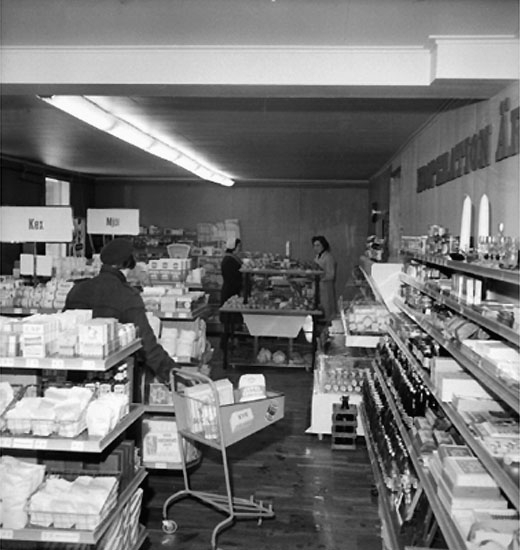 Konsum, affärsinteriör, kunder och personal.