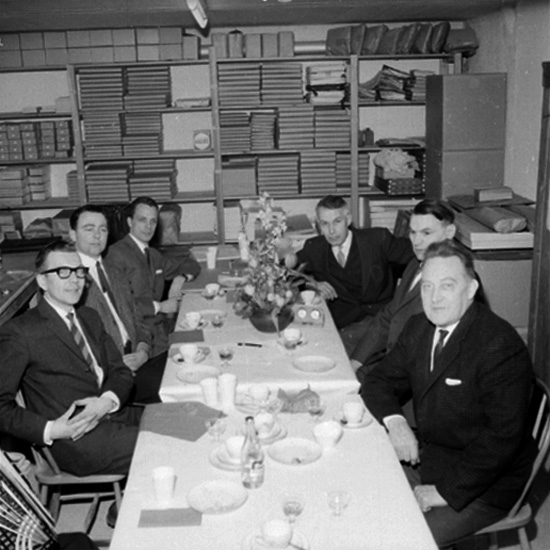 Rumsinteriör, grupp vid bordet, uppvaktning.