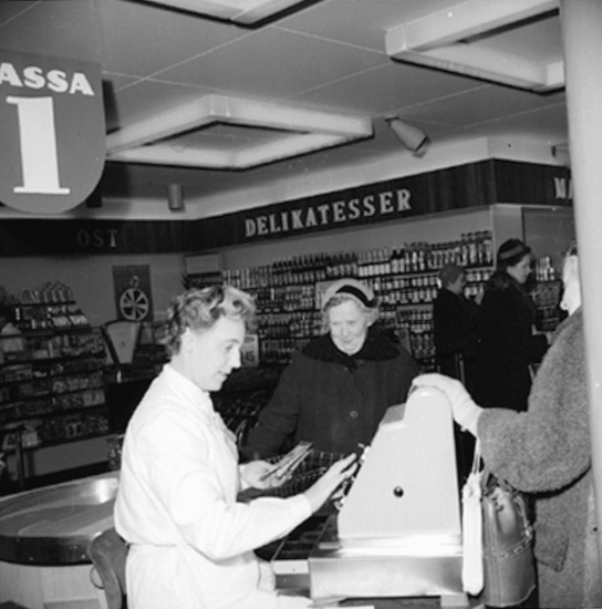Titel: Konsum Ströget, affärsinteriör, kunder och personal.