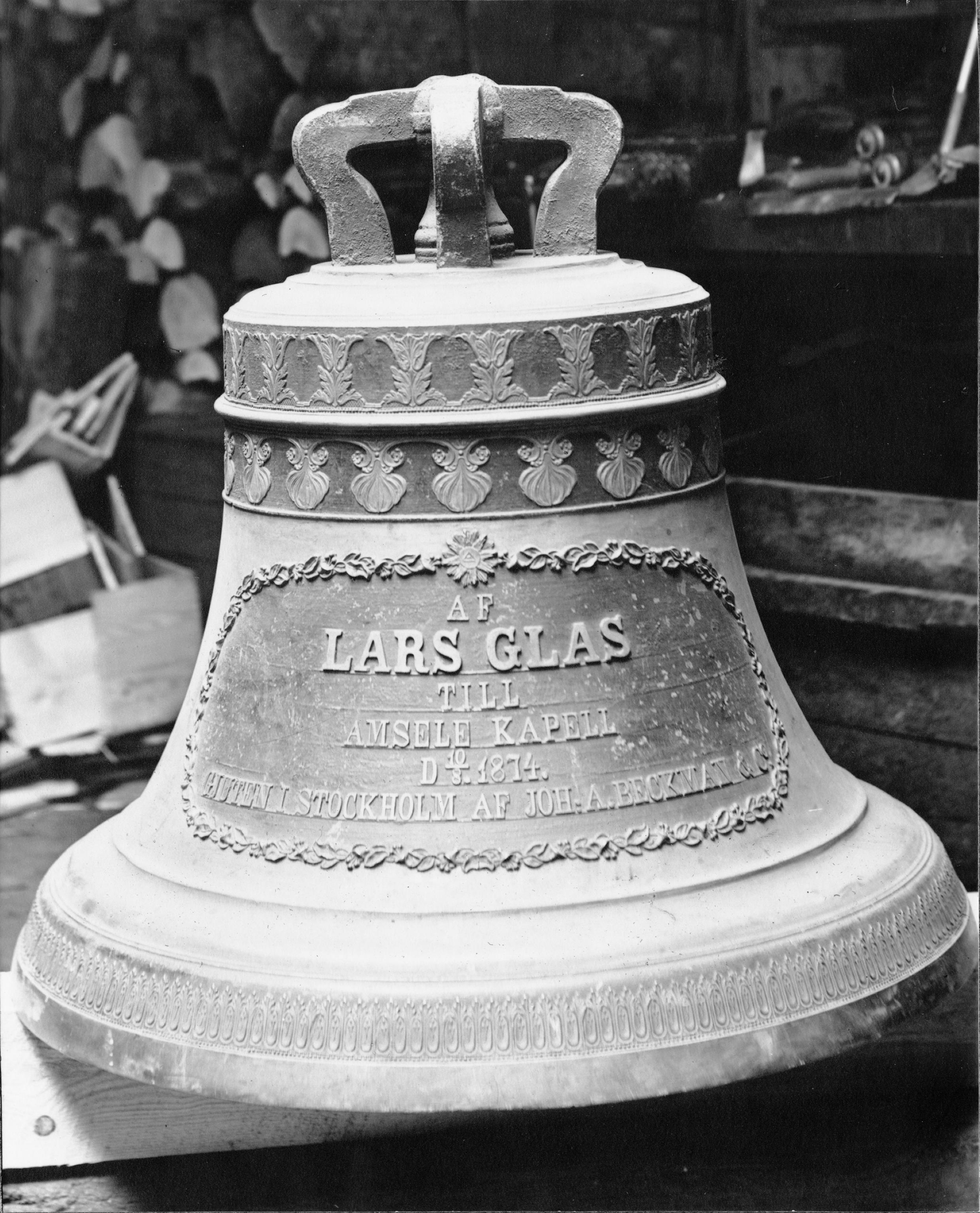 Beskrivning: Klocka, gjuten av J A Beckman, Stockholm, 1874.