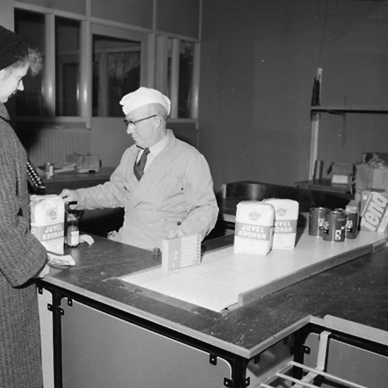 Konsum storköp, affärsinteriör, kassan, kunder och personal.