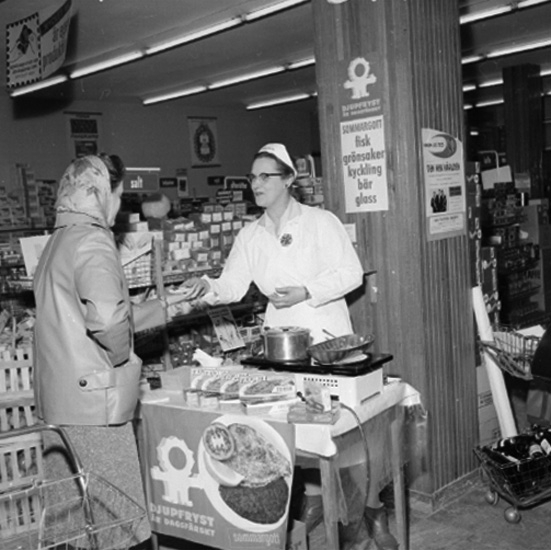 Konsum snabbköp, affärsinteriör, kunder och personal, demonstration av djupfryst mat.