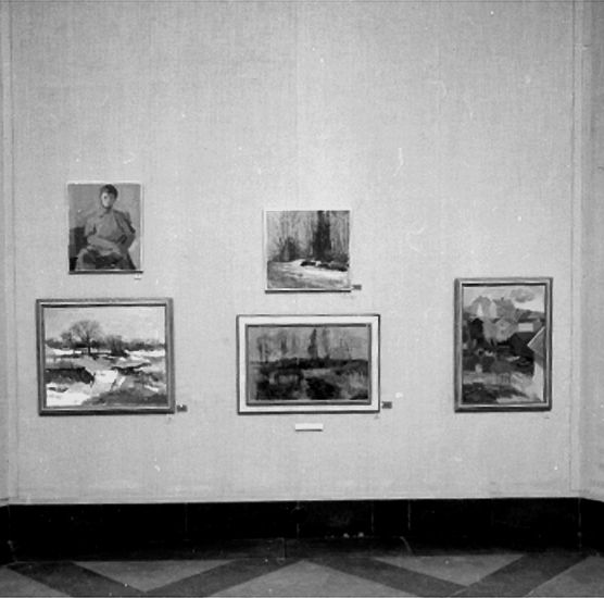 Inga Bergs utställning på Konserthuset, interiör av utställningssalen, tavlor.
