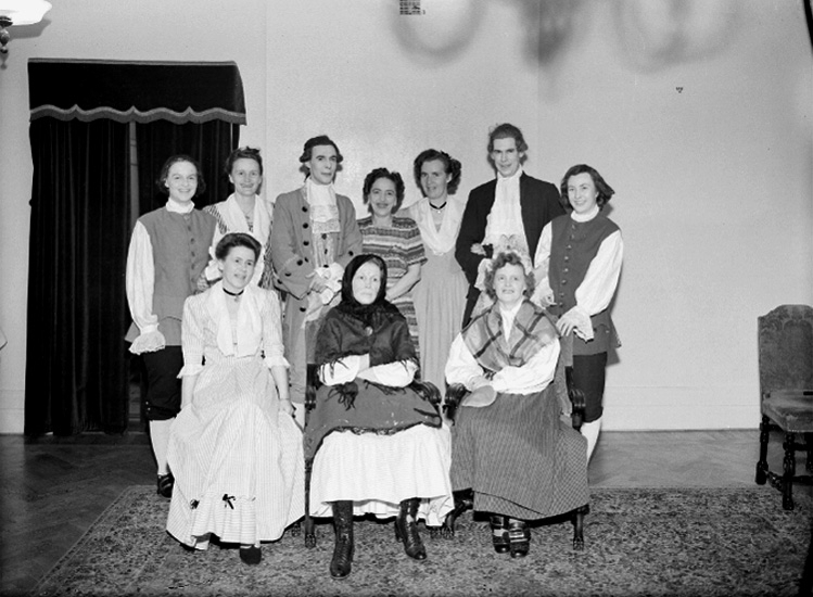 Rumsinteriör, maskerad, 10 utklädda personer.