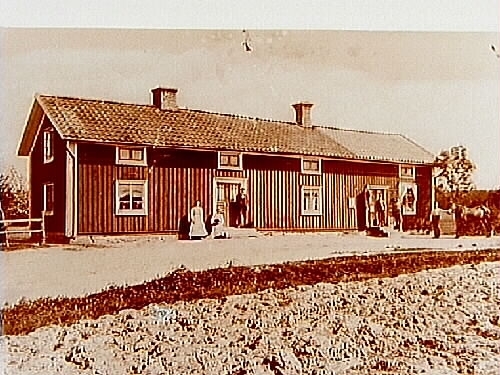 En och en halvvånings bostadshus, 6 personer och en häst framför huset.