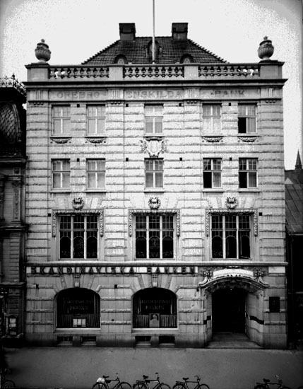 Skandinaviska Banken, stenhus i fyra våningar med barockpräglad fasad i Ekerbergsmarmor.