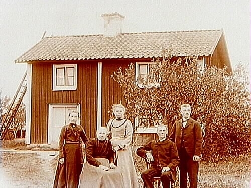 Tvåvånings enkelstuga, grupp 5 personer framför stugan.