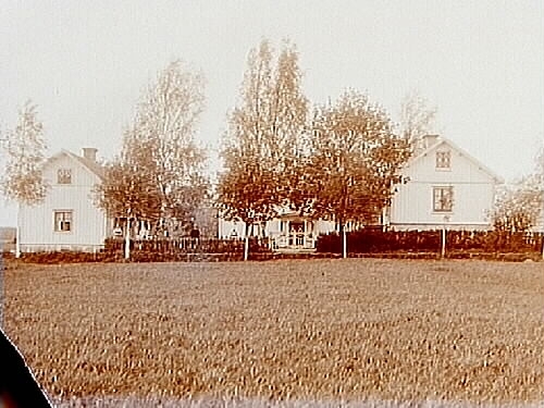 Tvåvånings enkelstuga, 2 st flygelbyggnader, 4 personer framför byggnaderna.