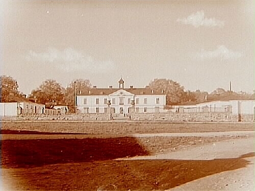 Gimo Herrgård, tvåvånings herrgårdsbyggnad med frontespis och litet torn på taket, fyra flygelbyggnader.