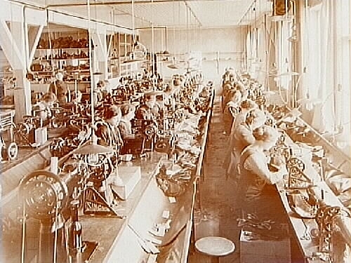 AB Skofabriken Kronan, fabriksinteriör, nåtlingssalen med nåtlerskor.