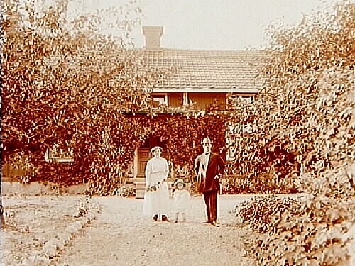 Familj 3 personer framför huset.