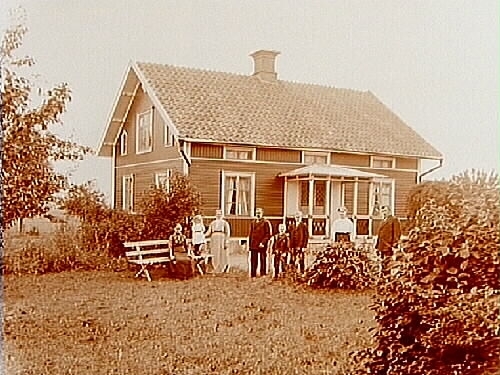 En och en halvvånings bostadshus med veranda, 8 personer framför huset.