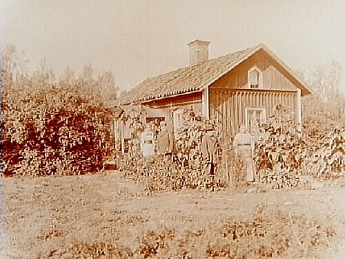 Envånings bostadshus, 4 personer framför huset.