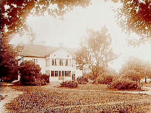 Tvåvånings bostadshus med glasad balkong och veranda.