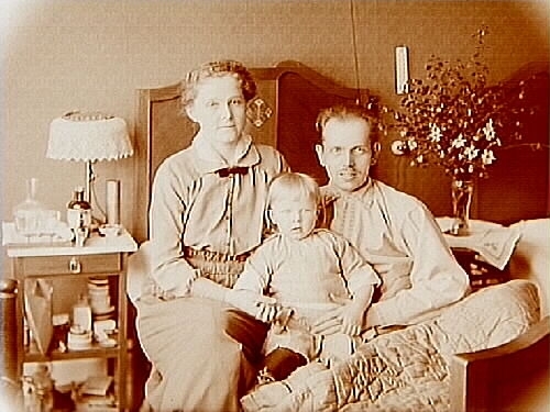 Rumsinteriör, en man, en kvinna och ett barn.