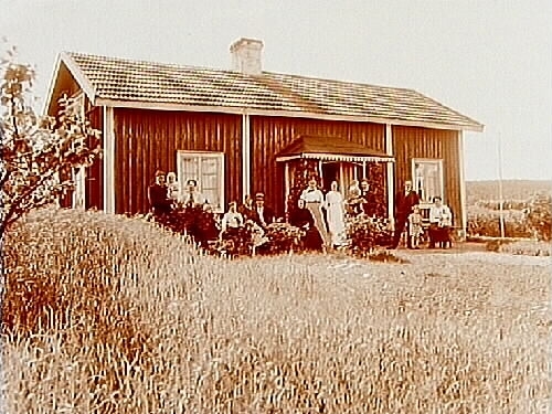 Envånings bostadshus, 15 personer framför huset.