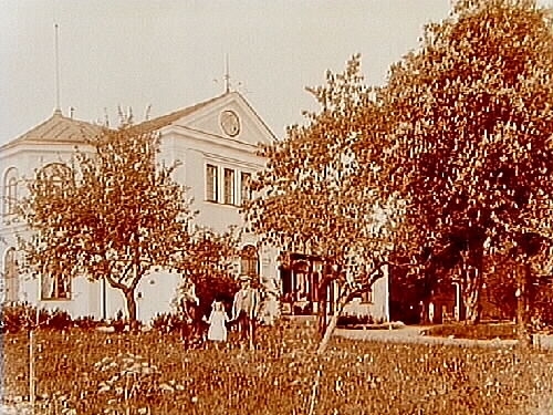Tvåvånings bostadshus, med tornliknande utbyggnad, veranda.